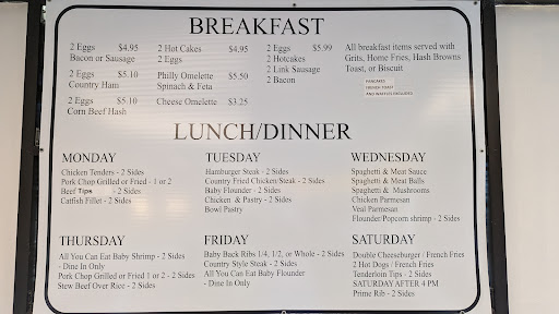 The restaurant has daily specials that showcase the freshness and variety of their offerings. On Thursdays, savor the All You Can Eat Baby Shrimp or choose the tender Pork Chop, either grilled or fried, served with two sides. For something hearty, try the Stew Beef Over Rice. Fridays are all about seafood, with the All You Can Eat Baby Flounder and flavorful Baby Back Ribs (available in 1/4, 1/2, or whole servings) taking the spotlight. If you're in the mood for a classic comfort dish, the Country Style Steak with two sides is a great pick.