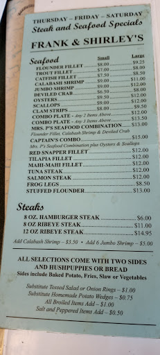 For seafood lovers, Frank and Shirley’s offers a tempting selection of fish and shellfish, including Flounder Fillet, Trout Fillet, Catfish Fillet, and crispy Calabash Shrimp. There are also delicious options like the Oysters or the Deviled Crab Fried for an extra kick of flavor.